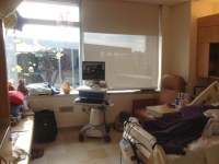 He also volunteered to take the night shift – thus my nice morning waking up at home. Kimberly asked if she could join me today/tonight. This has been fun – I like to have a friend while Jackie sleeps. We enjoyed exploring the OHSU campus outdoors in the sunshine. This new room is very nice. Plenty of space, two large windows with a great view, a recliner that lays back for Kimberly and a padded bench that should make a decent bed tonight.