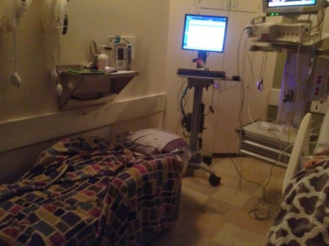 We were up and going by 5. Jackie’s blood pressure had dropped quite low so that when they tried to get her on her feet, her vision went black. Luckily she had her central line so they could empty an IV bag quickly – It worked rather well because it gave her a couple more hours before having to get out of bed again. Mark came to spend the day with Jackie around 9:30. By the time I was home he had texted to tell me that her central line was out and she had been transferred to the floor. I had some nice hours at home to shower, take a nap and enjoy some homemade pretzels that David made. Nap and shower were amazing, but mostly I enjoyed those pretzels – he asks me to make them often and now I see he can do it on his own. Yummy. We got through afternoon driving and were able to pick up Natalie from tennis and head back to hospital for a little family party. We bought the new Thor movie, but it isn’t very exciting on the small screen so we resorted to our favorite hospital family activity — playing in wheelchairs through the now deserted hallways. Well, not the whole family. I tend to stay behind. It is a little unnerving that we know so many back hallways, nooks and crannies around OHSU/Doernbecher hospitals. We spent so many holidays and late nights here with Greg… Mark always knows how to entertain the children.