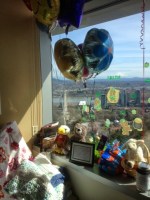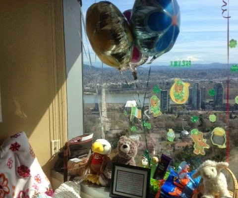 Our room has a nice, wide window ledge. While Mark and I overlapped our hospital time today, I gathered her gifts and decorations and placed them all on the ledge to enhance Jackie’s view. It looks cute – and gave Mark something to laugh about because he spends his time gathering things and putting them out of the way. He did mention that I should maybe rethink putting the chocolates in the window – in case they will melt. I assured him they would be fine because he has the temperature in the room turned down so low. When the doctor came to visit he chatted with us about the nice room (I had implored him to let us recover at Doernbecher with the nice accomodations); and he admired Jackie’s decorations. As he left he warned us that the chocolates in the window might melt. Mark’s response —“I knew I liked that guy!” Seven hours later – the chocolates never melted.
