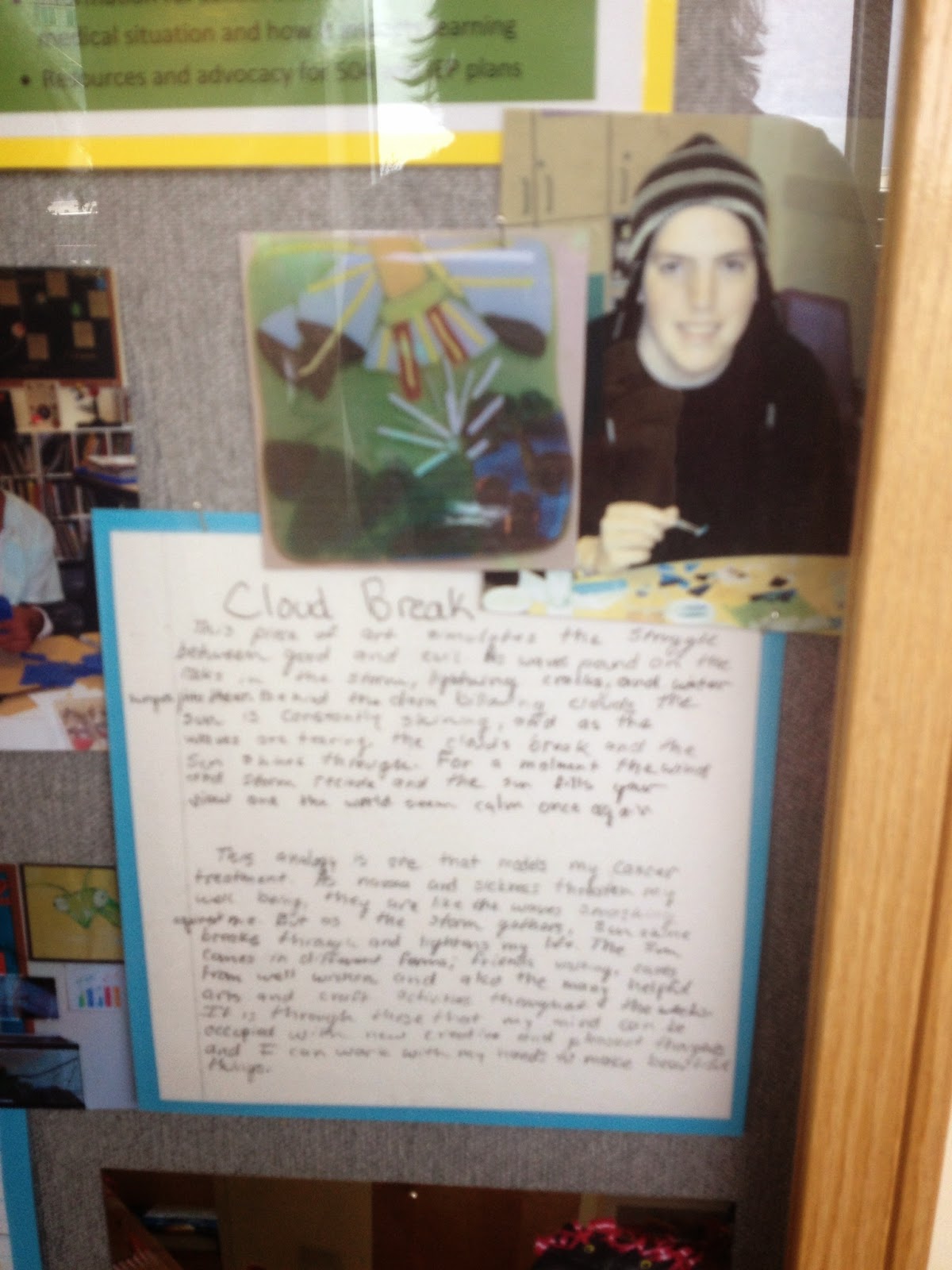 This was all done as a school assignment in the oncology ward. They have a full time teacher employed to help the patients with their work. She either works with their regular school teacher, or tutors them privately if they have had to drop out for the year. Some kids simply miss an entire year for treatment and recovery, others just a few weeks. Greg was taking classes full-time at Clark Community College in order to graduate from high school with his associates degree. He had also done this his junior year so he had enough credits to graduate. He began treatment in October, so we let him know he could just stop school altogether, and still be ready for BYU in the Fall. He wanted to finish with the AA; mostly to say that he had finished what he started out to do. He loved it when he was well enough to go and visit with the ladies at school. Art was particularly stimulating and when he heard it may lose some funding, he wrote the little essay to go with the tile. (Most of the art he did was with CHAP [Children’s Healing Art Project] because they came at least once during our stay and would bring supplies to our room).