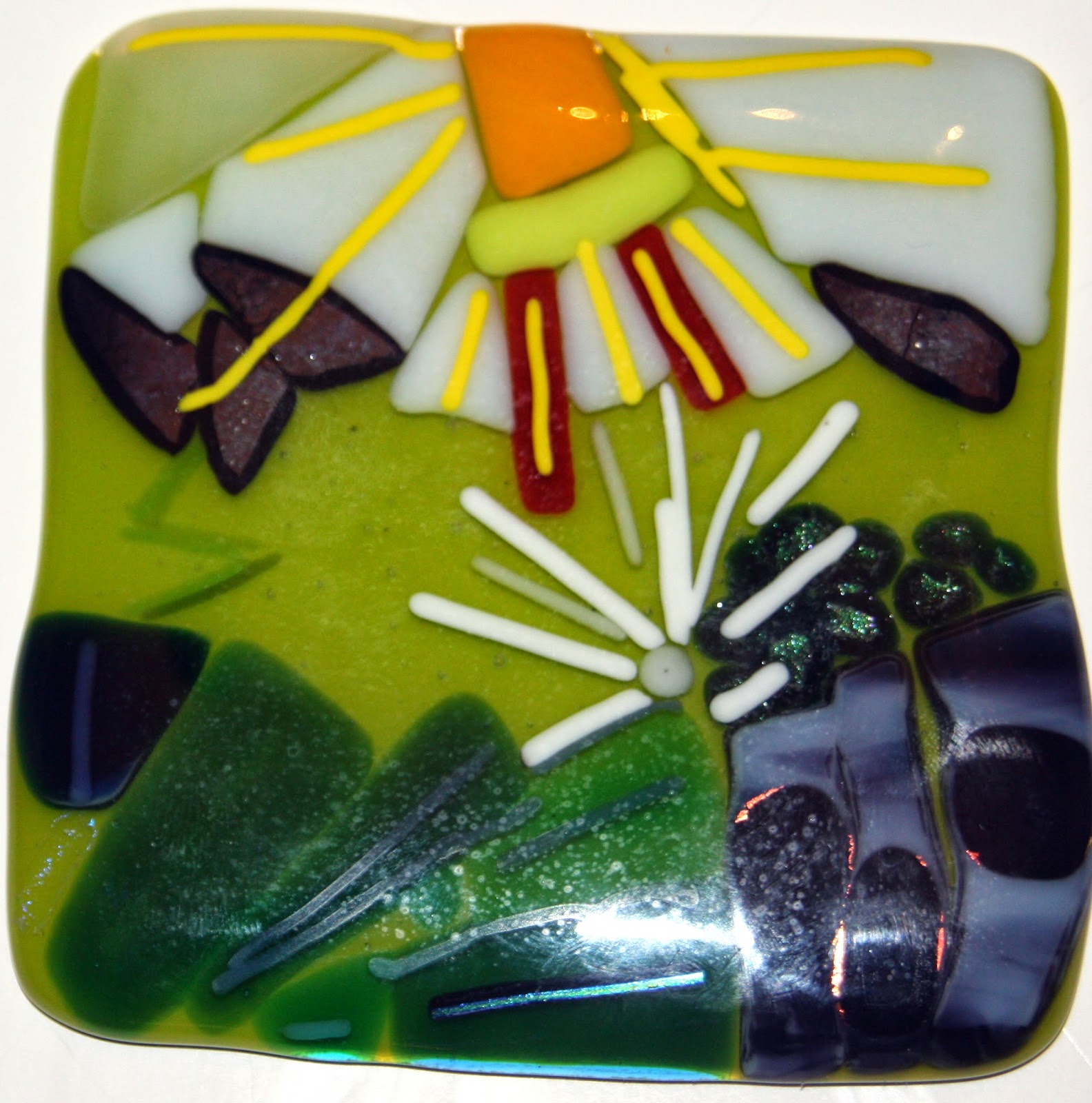 The ninth floor of Doernbecher Children’s Hospital is connected to OHSU by a short skybridge. We like to walk here and see that Greg’s photo is still in the display case. While he was undergoing chemotherapy he created this layered-glass tile and wrote the following: