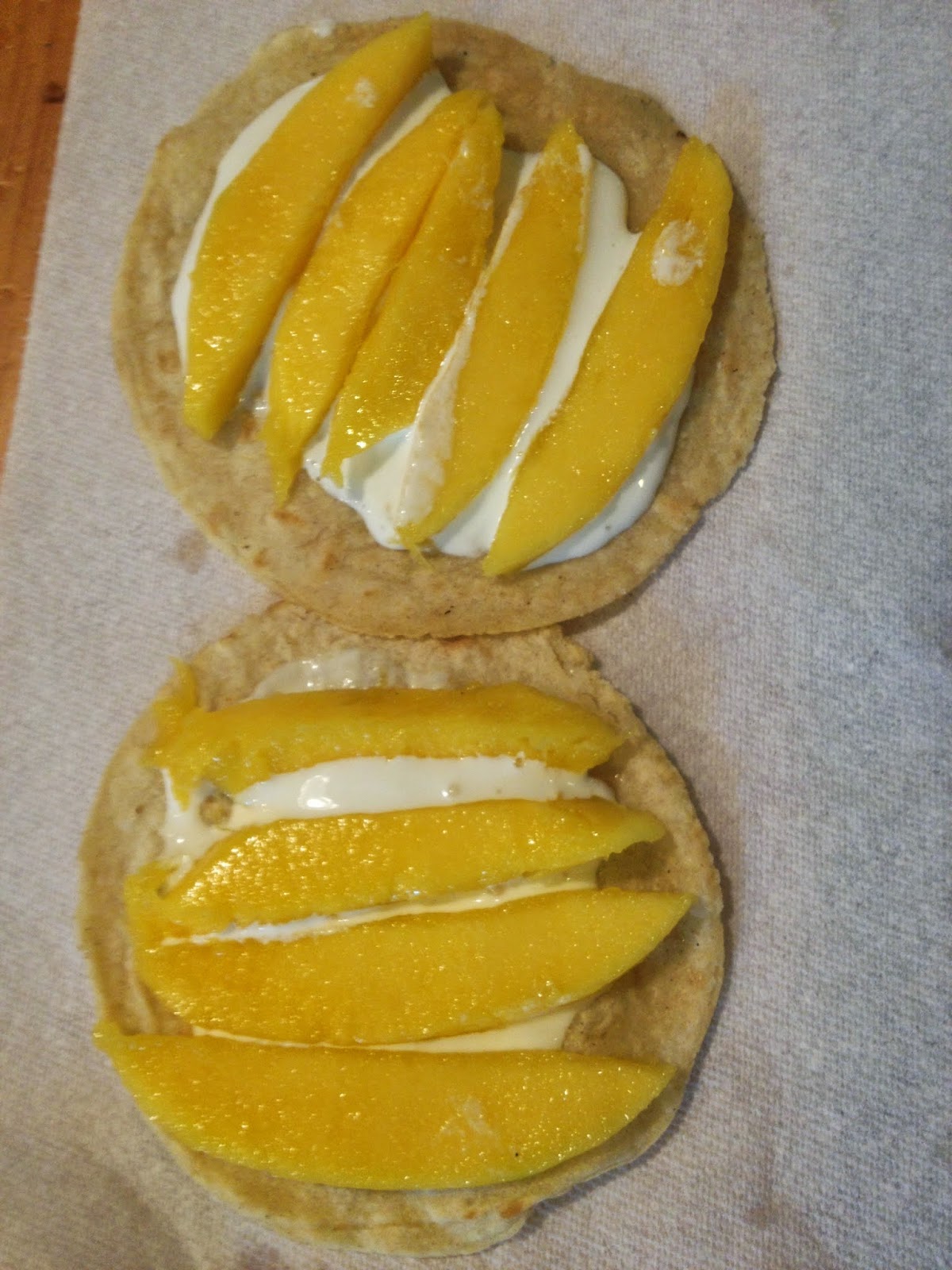 | Lunch – I invented these yummy little homemade tortillas with Mexican crema and sliced mango. Eaten warm – YUM! |