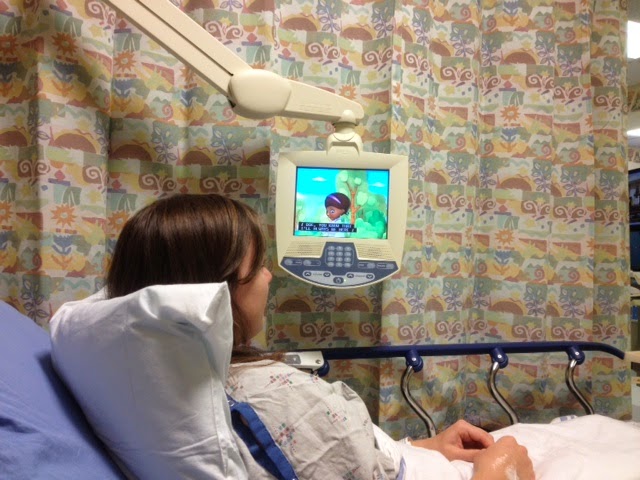 This is our first time to have surgery through the pediatric hospital. Greg came here for some minor procedures, but otherwise the kids have gone through OHSU. This is nice – when Jackie and Greg had surgery they had to get permission to let both parents come to the waiting area. Here they have plenty of chairs so that even Jackie (who will hang out with us today) is allowed back. They also have numbing cream on both of Natalie’s hands and arms so that they can draw blood and start an IV with no pain, not even a lidocaine shot. CHAP is in the waiting area until noon so that we can make a beading project when we go back out (unless we are still waiting back here until then). We did have a good giggle when she turned on her television. (see photo)