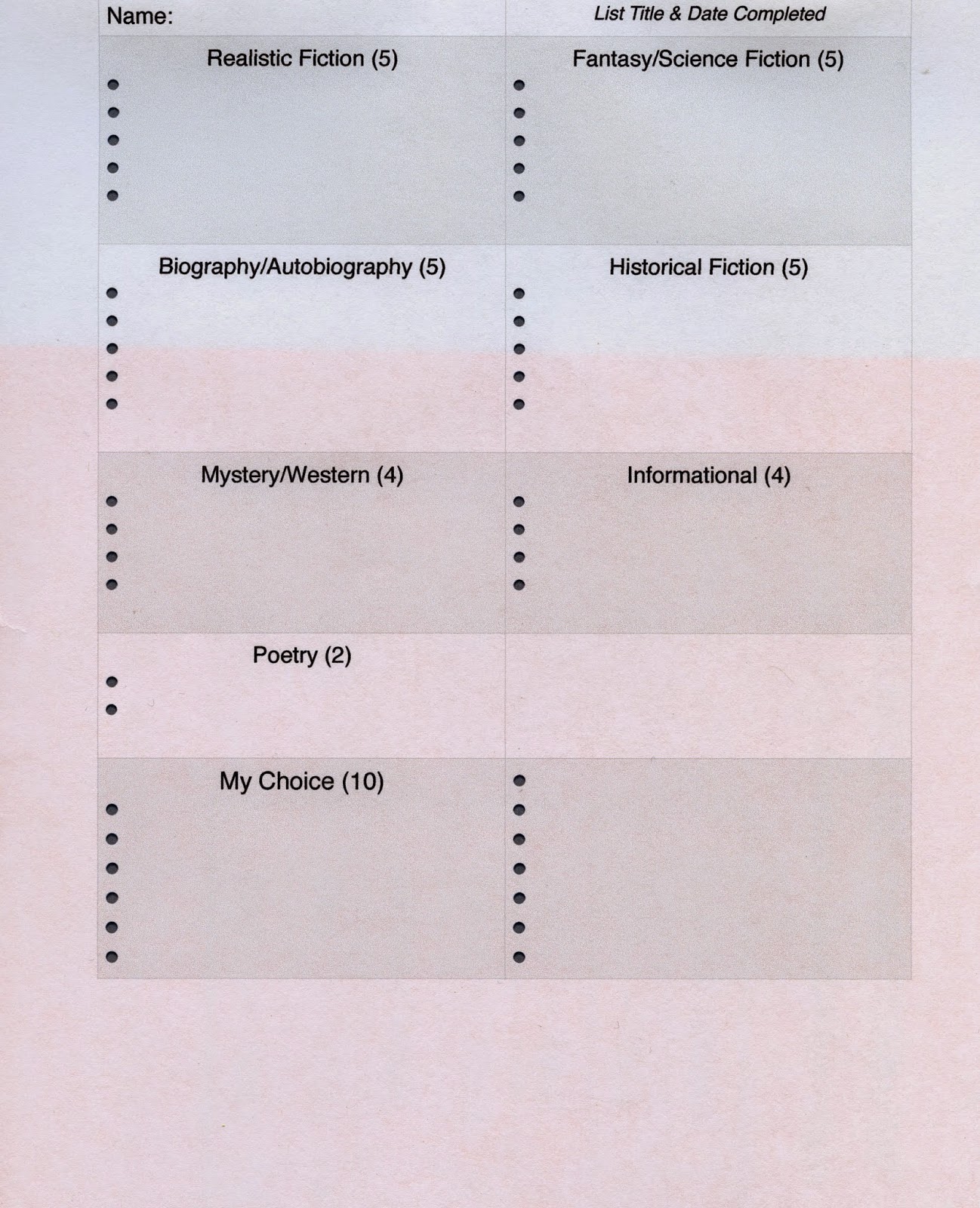 I blogged earlier about now knowing what kind of “program” to use over the summer – (none, we just played), and when school came I still had no ideas.  On the way home from dropping off Jackie I listened to The Book Whisperer (audio book) and realized that this would be a fun program for the family.  I typed up a form for each of us and that is all that it took.  We have very few rules, just make sure to cover the required genres and any book over 350 pages counts as two.