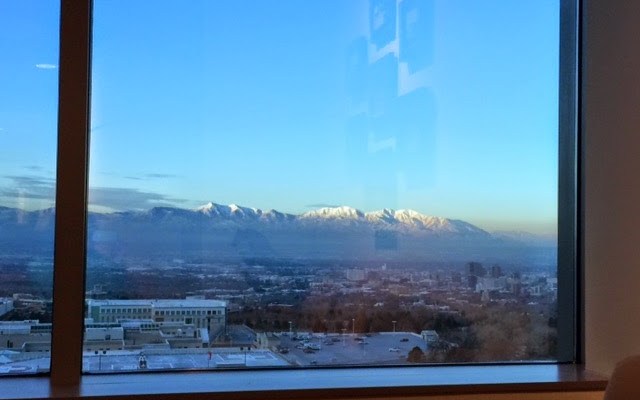 | Sunrise across the valley as I read in the lobby this morning. |