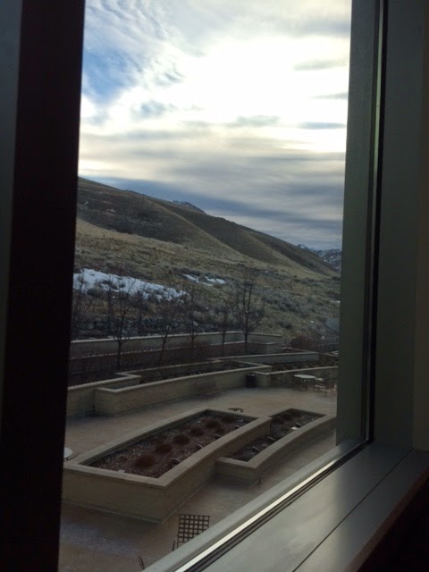 | Sunrise across the valley as I read in the lobby this morning. |
