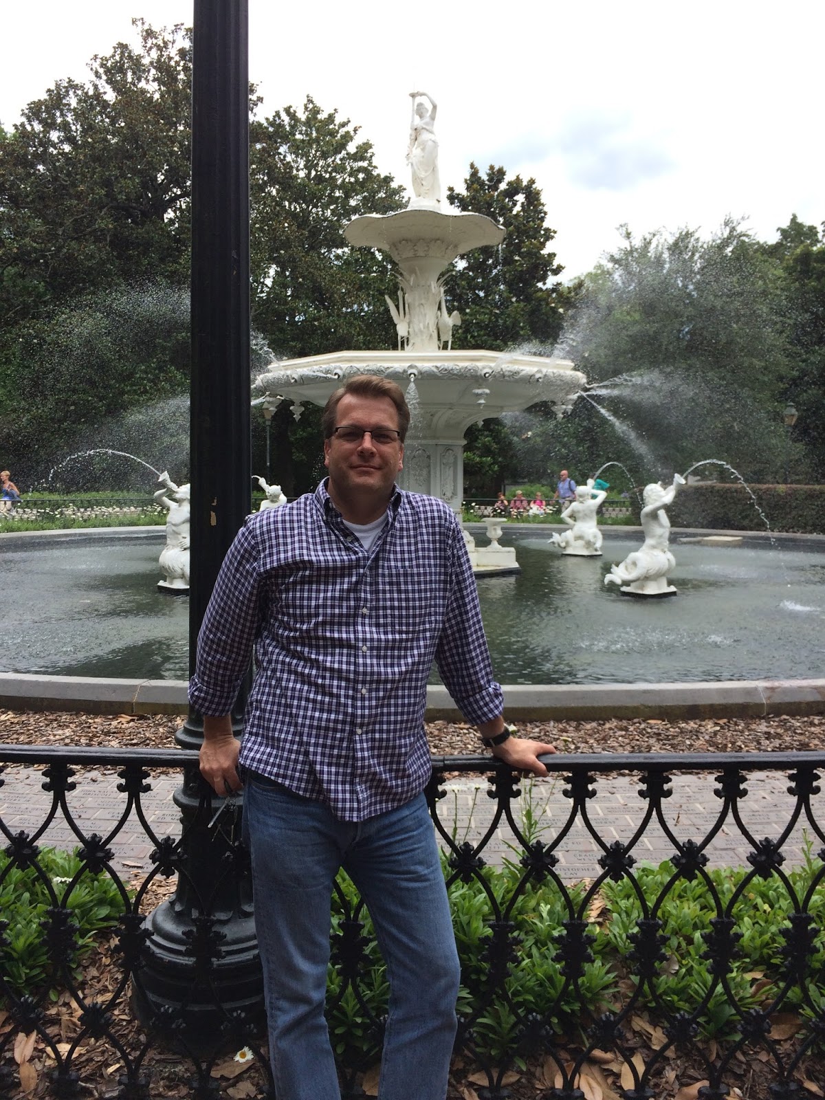 | At a beautiful fountain in one of the many parks found in Historic Savannah. |