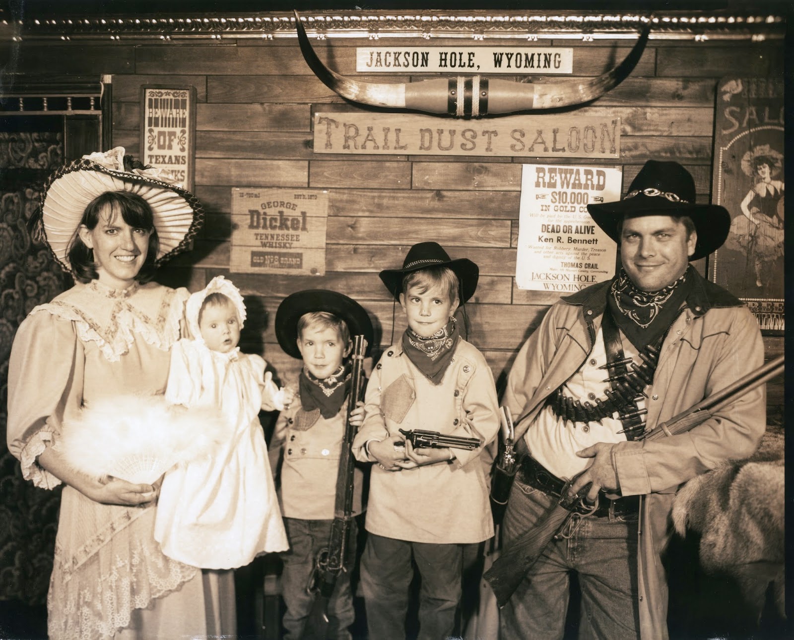 Two years later we found ourselves at Lake Tahoe with Mark’s family. We took an afternoon off from the reunion to have a little family time and explore Silver City, Nevada. Of course a tourist town like this would have a photo studio – and we had a new little Greg to be added to our picture, so we once again splurged. Both of the boys were pretty excited to be holding guns, especially when Daddy had one also.