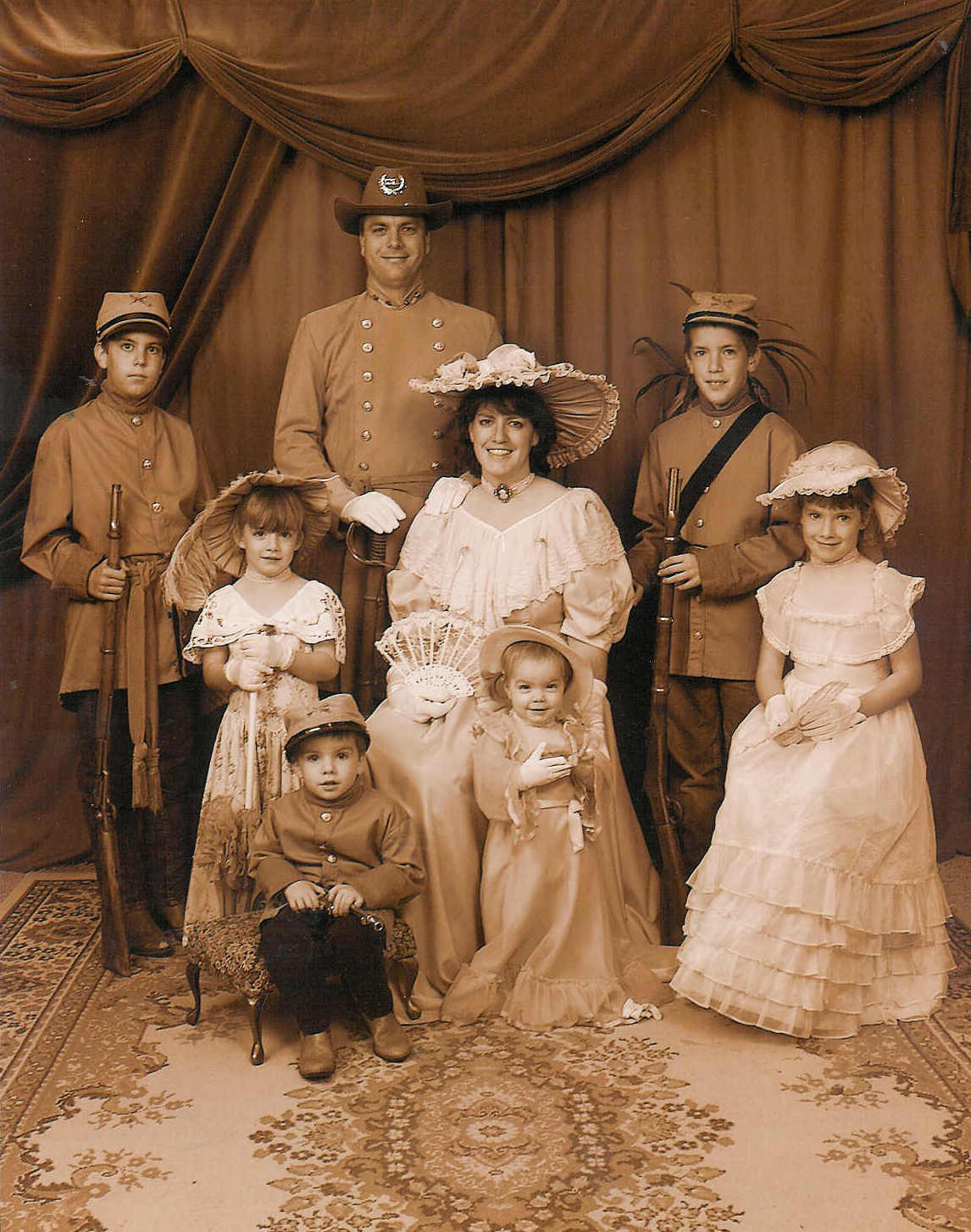 Life got a little crazy by the time our sixth baby, Kimberly, arrived. It looks like she is about two years old in this photo and we hadn’t been on a vacation – at least not one with old fashioned photos. We had moved from Oregon to Washington in July 2001, and this was 2004. Everyone was happy with the Civil War theme as there were swords/guns for the boys and the girls were dressed up to be beautiful. We like this one because our little one behaved very well, but wasn’t thrilled to be wearing gloves. You can see that she is taking one off while its pair is there on the floor already. A fun moment to capture.