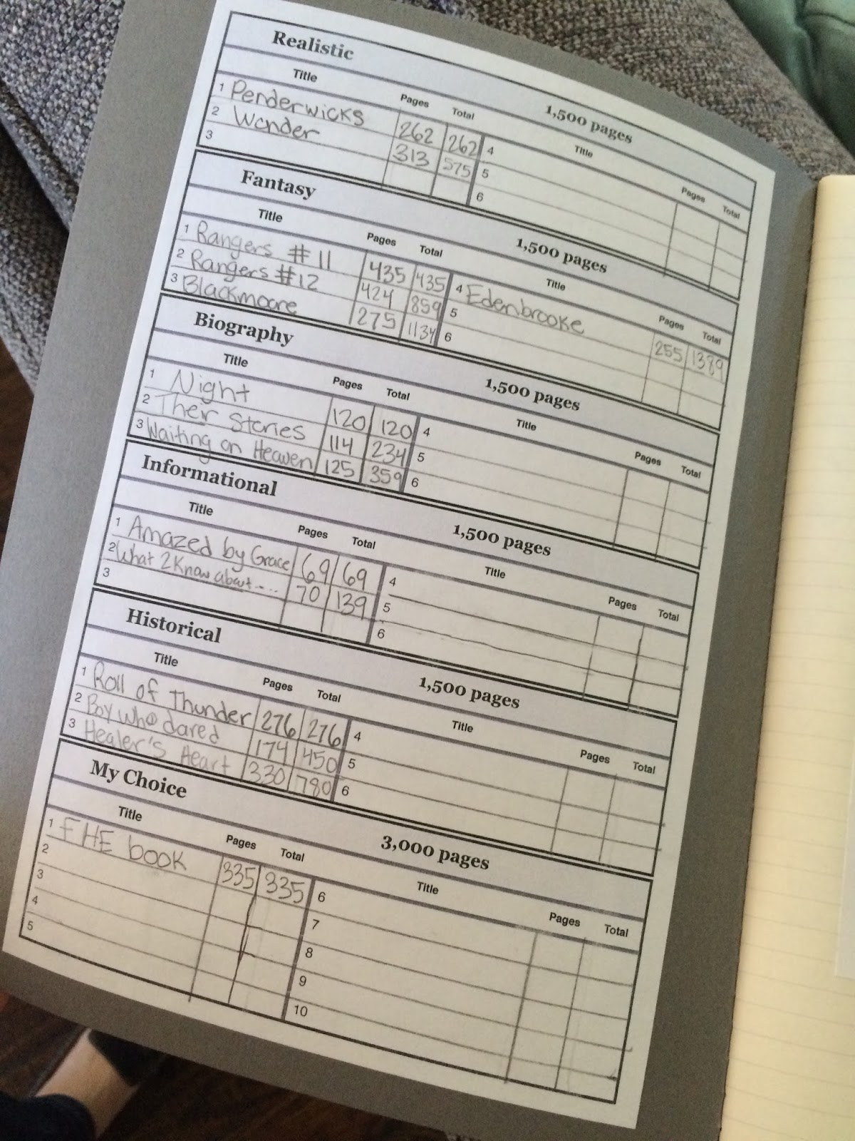 This time around we aren’t counting books, we are counting pages. We can read a lot of small books, one large one.and anything in-between (Natalie just pulled out the unabridged Les Miserables which should fill her Historical Fiction requirement by itself… ) We will each read a minimum of 1,500 pages in the following genre: Realistic Fiction, Fantasy, Biography, Information and Historical Fiction. We will also have 3,000 pages in My Choice.