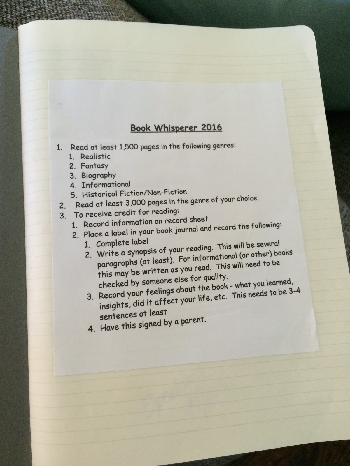 A new twist… This time we have to write. Yes, write… and I heard more than a few grumbles about this. I bought the set of Moleskine notebooks from Costco – a little nicer to write in than composition books. Inside of each book is the record sheet (since I kept losing my last one… seriously, once I found it outside in my backyard?!?) and the new rules. We just have to write a short report on each book and what we learned. I know… this kind of defeats the purpose of the Book Whisperer -reading-for-the-joy-of-reading… but last time there wasn’t a prize. This time we have prizes… and it isn’t hard writing – more of a record that I wished I had from before. What if I had written down a few notes on every book I have ever read? What a treasure (for myself)! So… we will be writing.