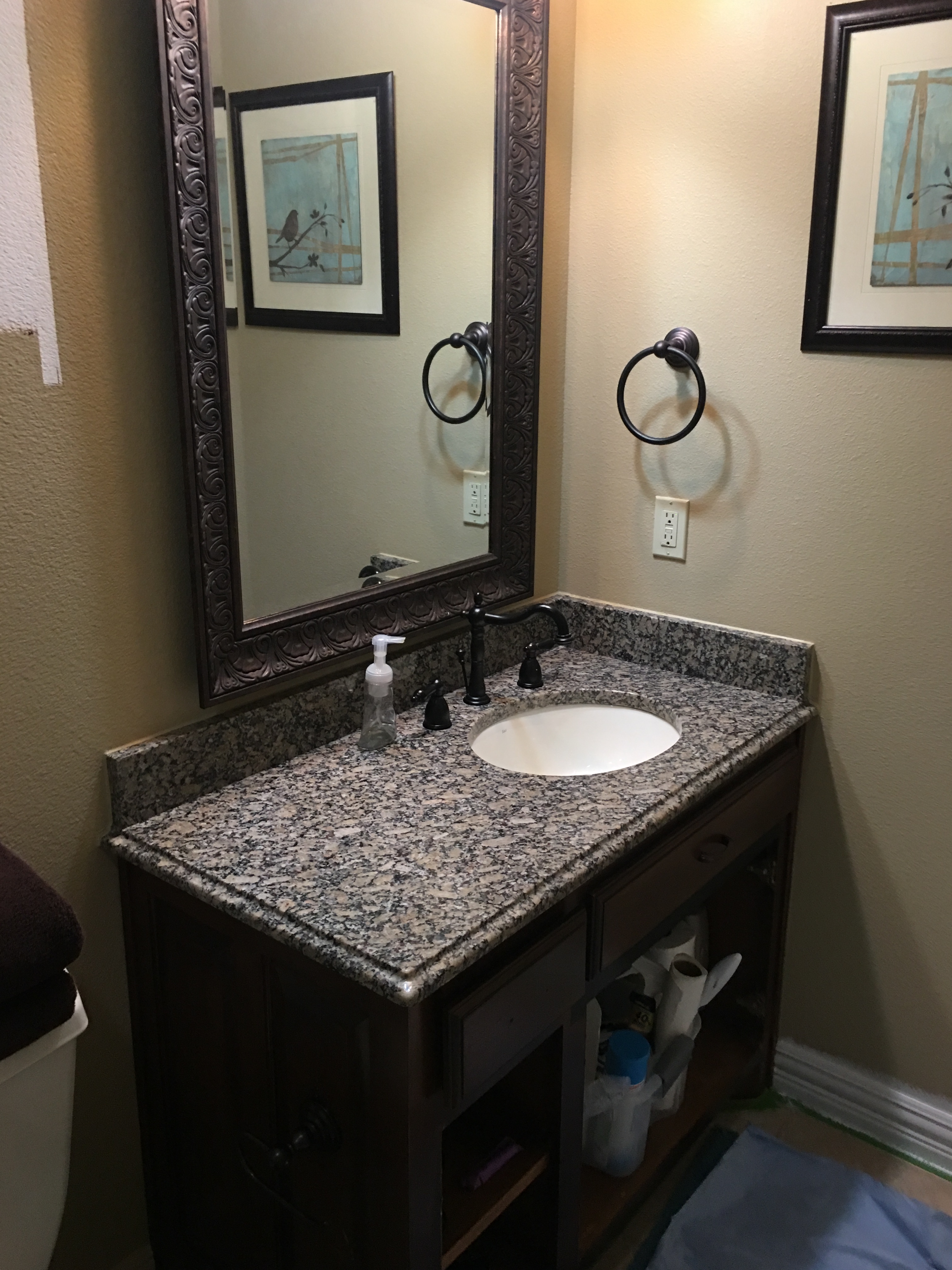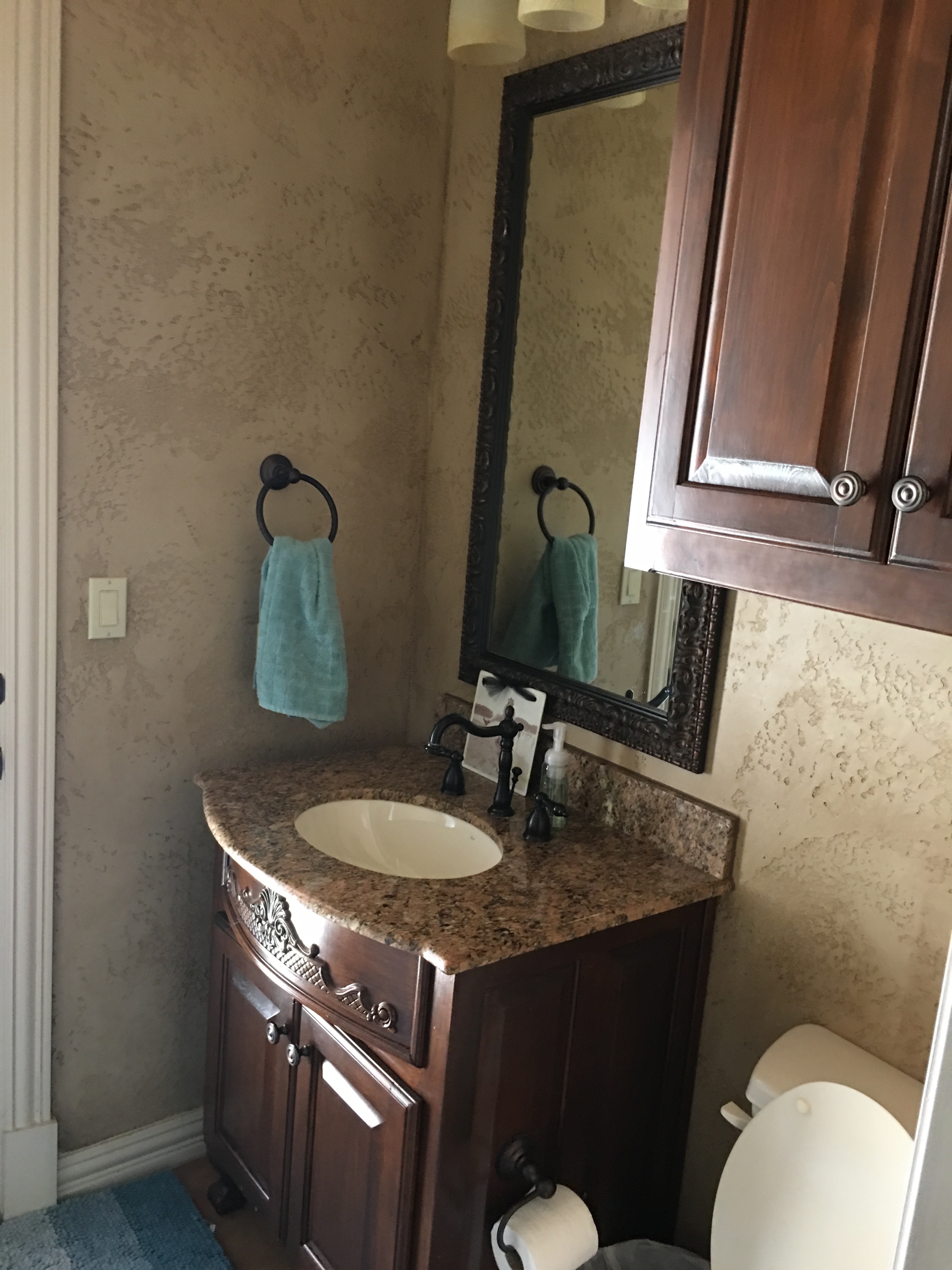 This is a small guest bath off of the game room which also had a door onto the patio. These are the only photos that I can find and I am so sorry that I didn’t take a picture after it was completed! I love the quartz countertop which was made with material left over from the kitchen remodel. I painted the small ceiling blue – similar to the color of the vanity. The stained concrete floor was also in the game room so we left it alone. Such a bummer that I don’t have more photos.