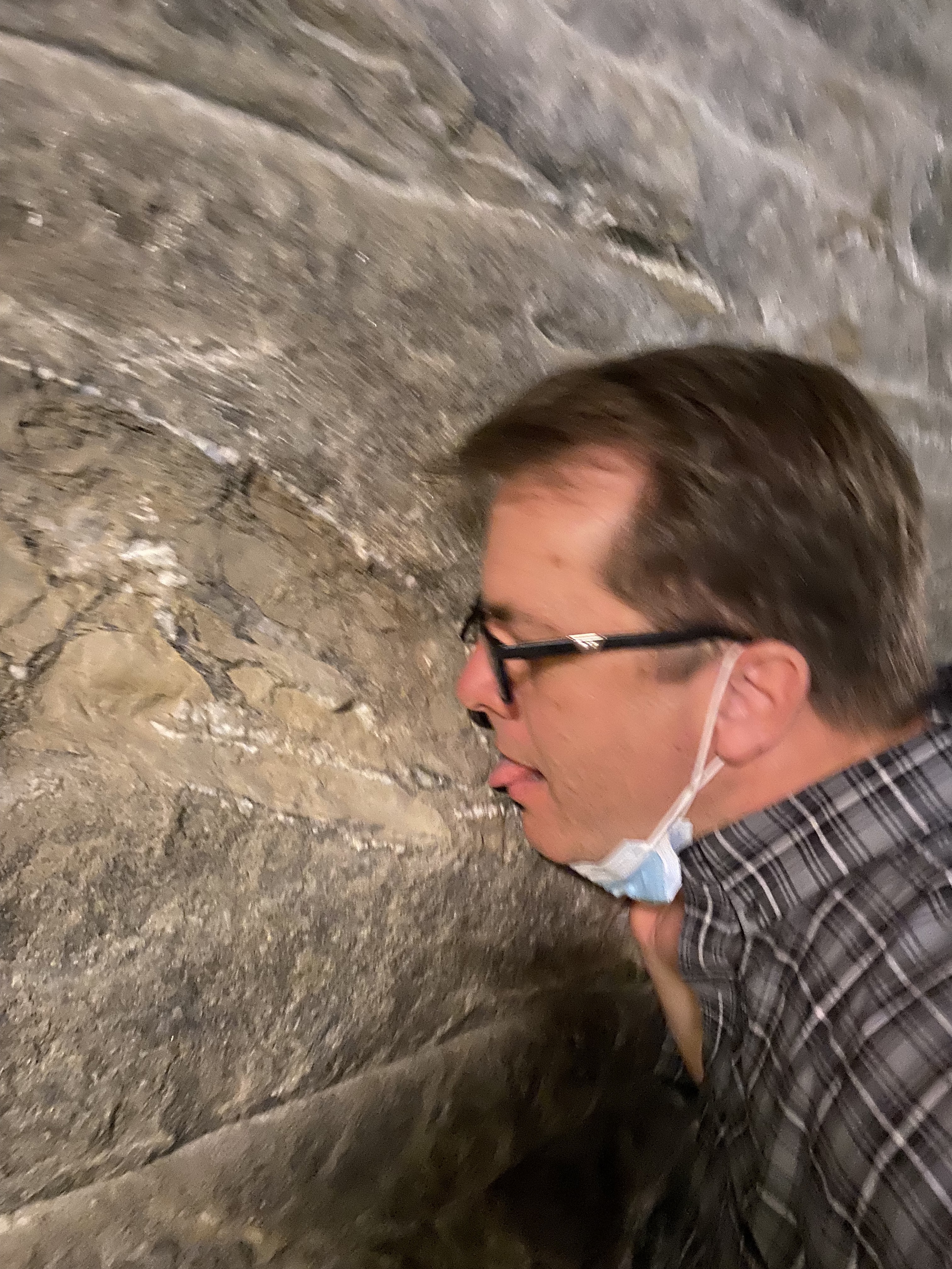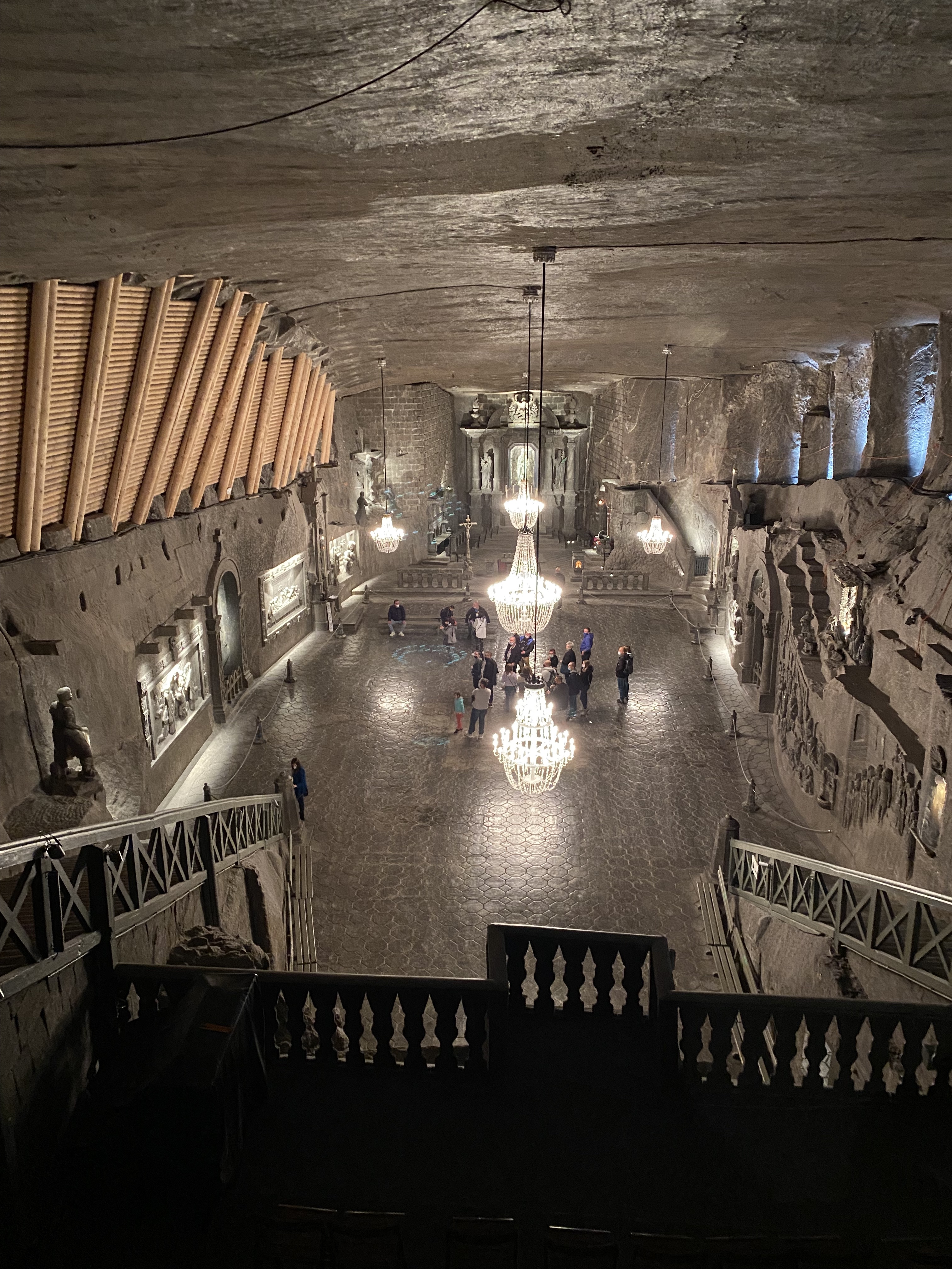 The salt mine was cool and we were glad that we went. We parked at the first lot we saw due to our paranoia, and then we had a bit of a walk to the actual parking lots which had plenty of space. Oh well. We had time for a quick ice cream cone before our English tour. For the several English tours we have been on we haven’t heard anyone speaking English – but I think they choose the tour because they don’t speak Polish or it is just the next available. In Auschwitz we all had our own headset so we could easily hear our guide. In the salt mine we had to work to stay near our guide. His accent was difficult to understand and most of the tour group spoke their unknown languages to each other very loudly. We missed most of the actual “salt” information because at the beginning we hadn’t yet learned to stand right next to him. We did hear him say it would be a three hour tour – and here again we had not eaten lunch. We were relieved that it only lasted two hours and the third was if you wanted to proceed to the museum (but he said he had already told us everything). The two hours were interesting and entertaining. We descended something like 822 steps and ended up 135 meters below ground. There is prehistoric evidence of man gathering salt at this area through the salty water which they would boil down. When that became scarce they began to dig. This mine began in the 1600s.