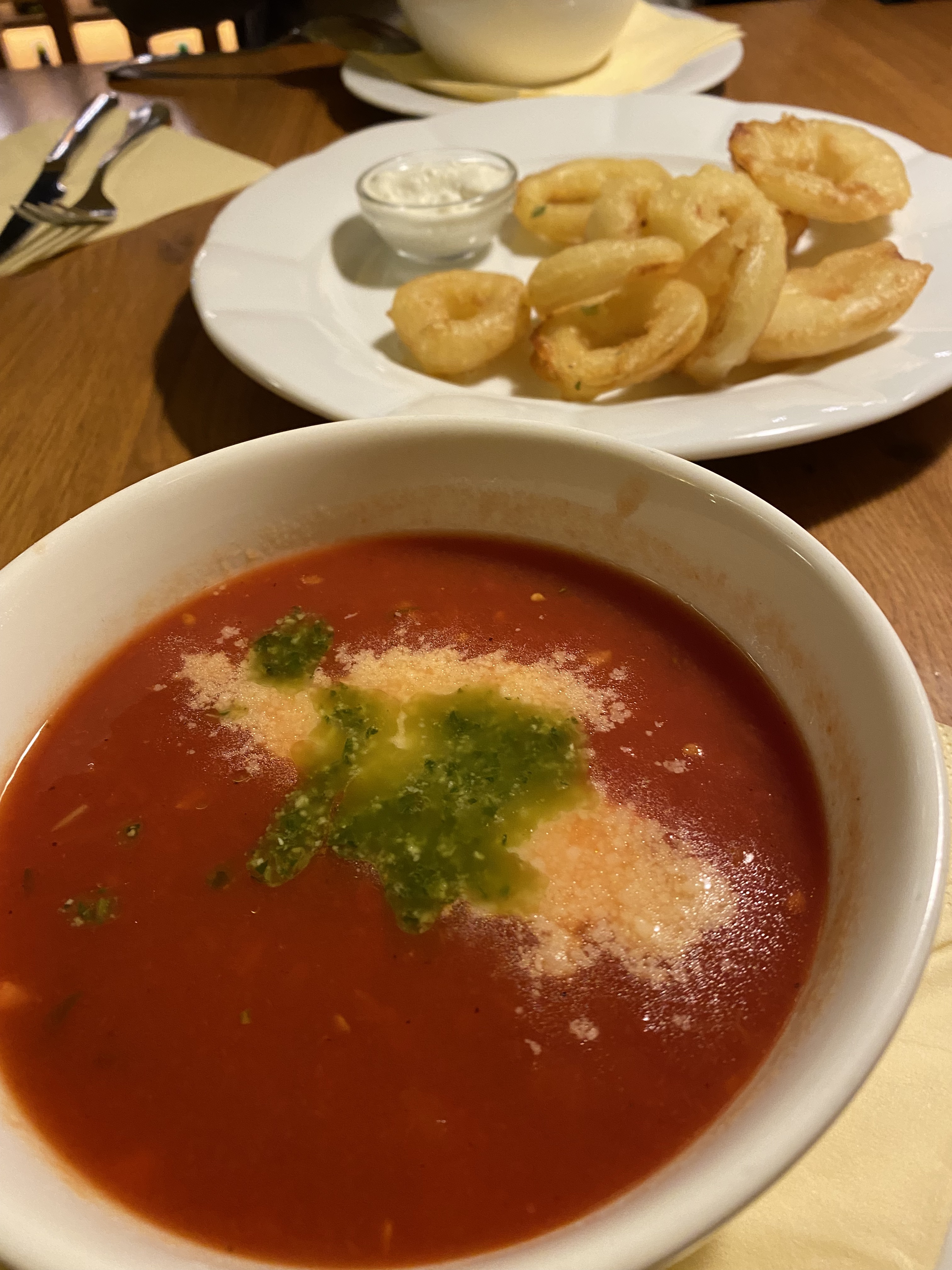 We were so full from lunch and tired from walking – we rested all afternoon and then went to find some food around 8:00. The whole place seemed shut down. We walked up and down streets and finally found a delicious little spot. We both ordered tomato soup and dessert. This makes the narrative because this soup was the best! I thought the Poland soup was the best I’d had but this topped it. We were still talking about it the next morning!
