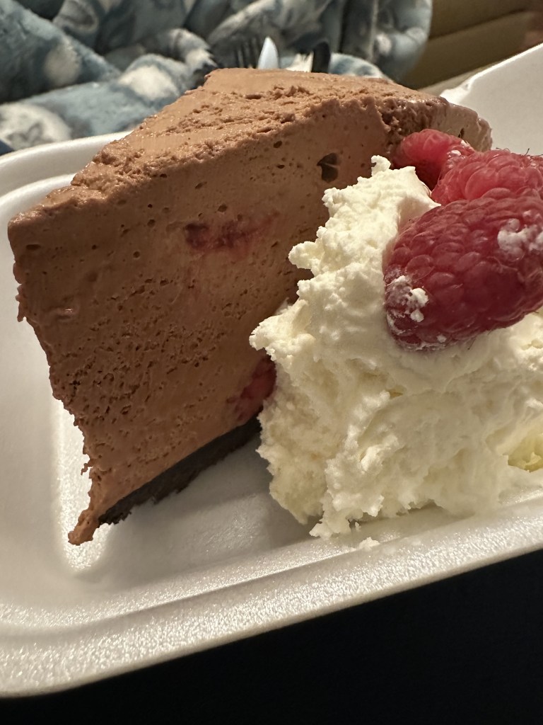One thing we like about Hope Lodge is that we can bring our own food. His appetite isn’t great, but he has been craving filet mignon so we went for steak last night. He also loves a good piece of pie, but it turns out that his “pie” diner of choice (Left Fork Grill) closes at 3:00. Fortunately some friends recently took me to The Dodo – a little restaurant not far from here that serves up some pretty tasty pie. Mark managed to sit at the padded booth of the steak house but we had to take the pie to-go. We enjoyed a cozy evening watching a show on the couch and eating pie.