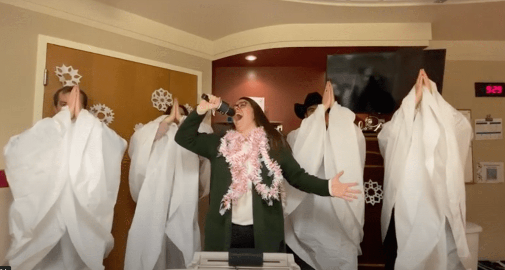 We did not have Christmas Blues. On the contrary – we had a great Christmas. I am just taking this opportunity to pass along our little tradition of sharing a Christmas video. Our kids are always in charge but we took off a couple years while I was sick. Obviously, this is also a sick year but they took that theme and ran with it. They showed up at the hospital and all that we had to do was sit there – very natural.