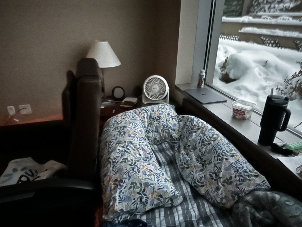 Sleeping: When Greg and the girls spent time at Doernbecher Hospital there was a twin size bed built in to each room for a parent. We learned right away that we would need to bring a foam pad to survive the nights and as soon as I learned to let the nurses take care of my children I found myself sleeping quite well. Huntsman also accommodates a family member. There is a couch that can become a bed though I don’t think it is quite as wide as a twin mattress. One night on that was all that I could take. Fortunately Natalie had left behind an old foam pad from college. We kept meaning to throw it away, but I rescued it and now it rescues me. It took me a few nights but I have learned that I usually sleep quite well if I back the recliner right up to the bed by my head. This helps me feel that I am not going to fall off the bed, but more importantly it blocks the lights when the nursing staff enters the room at all hours of the night. Most rooms also have a chair that I can use to partially block the very bright lights from the bathroom as they go in and out all night. Last night a CNA left the door open. I was too tired to go shut it myself so I just turned away. I have three pillows, just like at home. At first I tried to sleep with two but that means running into the wall or the recliner.