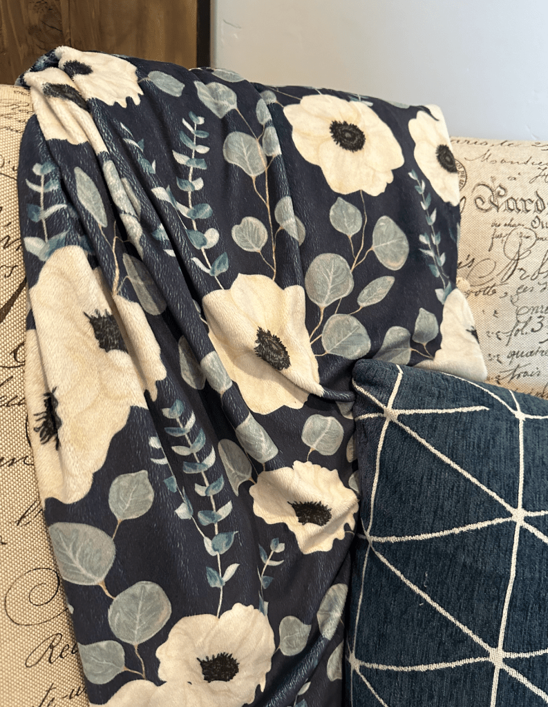 Soon after my daughter-in-law Ashley joined our family we all recognized that she has a true knack for gift-giving. Though just getting to know us, her gifts to us were both thoughtful and well-fit to the recipient. I noticed it and other family members also mentioned it to me. A year or two ago she honored me with the gift of what is now one of my favorite blankets. She had taken note that I usually travel with a blanket and the one she chose was soft, cuddly, colors I love and even floral. I like to have it in my front room so that I can not only look at it, but have ready access to it – but I keep other blankets around as well so that no one else…. well, you know… I don’t like to share it.