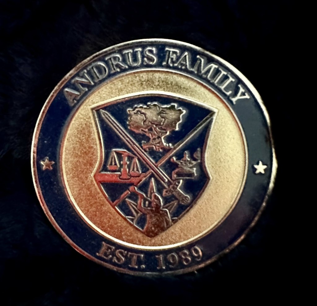 While we are on the subject of flags – over twenty years ago Mark began to sketch out a family crest and I will share what he came up with. Each line/shape represents something to Mark. My talented brother-in-law Ryan helped me clean up the sketch lines and I had flags made as a Christmas gift. As the children grow up and leave home they each receive their own flag. In Washington we flew our family flag along with our American flag. Several years ago Greg designed collector coins (like the military) to share and recently Mark gave us all a water bottle with the crest.