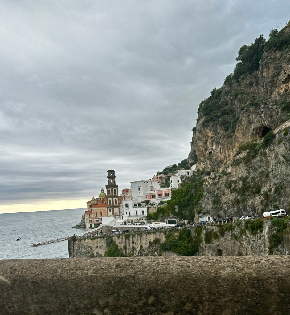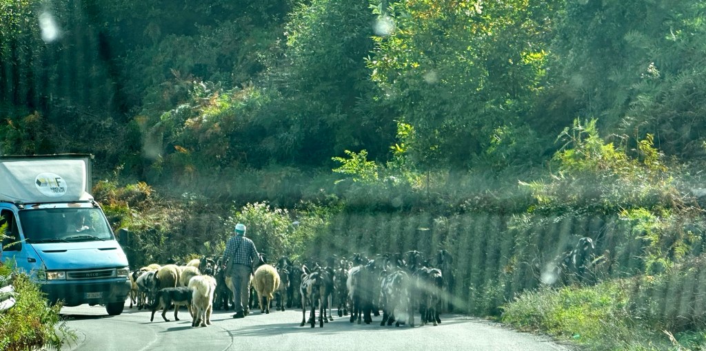 Finally on our way we drove right past Naples (a favorite of Mark because of the incredible pizza) and Pompeii (a favorite of mine because of oh-so-many old stones). On this day our goal was the Amalfi Coast. There were several ways to drive and we wisely chose to cross right over the mountain and land in the town of Amalfi. We first thought this was wise because of the grandeur of the scenery but later learned it was wise because it shortened the drive along the coast which was somewhat terrifying and mind/body numbing from the stress. We are currently driving a Jeep Compass which seems like a Ford Expedition around here – large and cumbersome. Our favorite part of the drive was the goat herder and his charges.