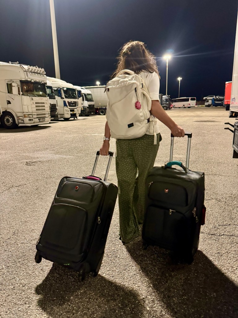 Anyway – we sat on that row of secluded chairs unsure of what to do next. Eventually we figured out we had to leave the terminal and walk down the street and through the giant parking lot where countless semi-trucks gather to board the ferry. We found ourselves carrying those bags down a flight of stairs, through the gates and into that circus of trucks. Some of them had parked over the walking path so we took off through the midst of them, weaving in and out. Pushing and pulling our bags over the rough asphalt and just hoping that our little wheels wouldn’t give out. As we neared the second terminal the multitude of motorcycles came roaring up – undaunted we took a breath and plowed our way right through them. The terminal was full of young families and so we just took our place at the head of the nonexistent line, determined to board first as though we had earned it.