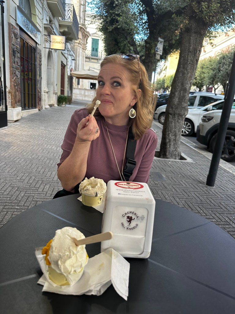We finally took a moment to enjoy some gelato – amazed that it had taken us so long. This was to be our snack so that we could eat some dinner in Brindisi before returning our rental car and making our way to the ferry.