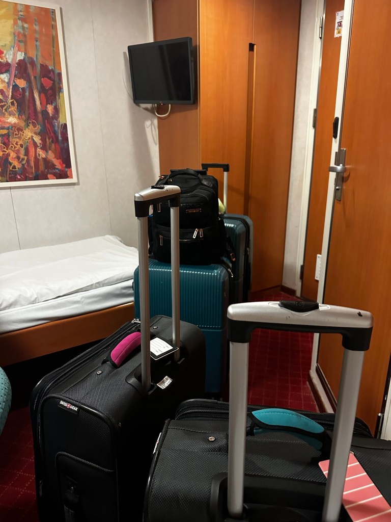 We did it – we were first on board. It doesn’t matter at all – but it was kinda fun. We settled into our cabin with two berths and went to explore the ship. Finally, though it was after 10:00, we found some dinner. Our dinners get later every night so I guess that Europe is already wearing off on us.