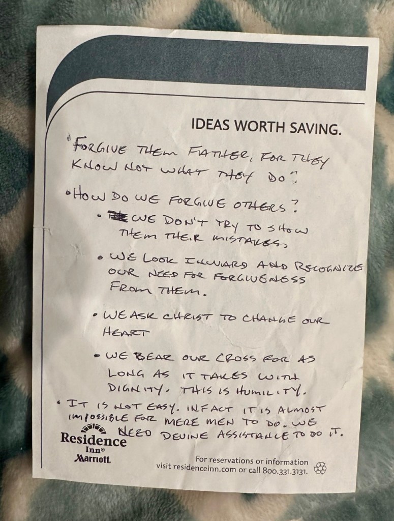 Here is one more thing: I have often thumbed through Mark’s journal and notebooks, but as I considered this topic, a small piece of paper was there that I had not seen before. I was so surprised at the timing of finding this! It contains his thoughts on forgiving and I will end with sharing them because I think they wrap up my thoughts in a concise way. My words came before I read his words and I love the way they echo one another. There must be truth herein. Here are Mark’s words: