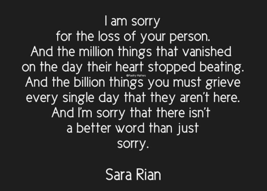 What can help and I’ve totally learned this since my wife’s death. Why not give them a warm embrace? Also, I don’t say “this must be difficult” (actually horrible) or “I can’t even imagine what this may feel like (They know!)” Rather, I tell them this is “awful” and I “totally get” what they’re feeling.
