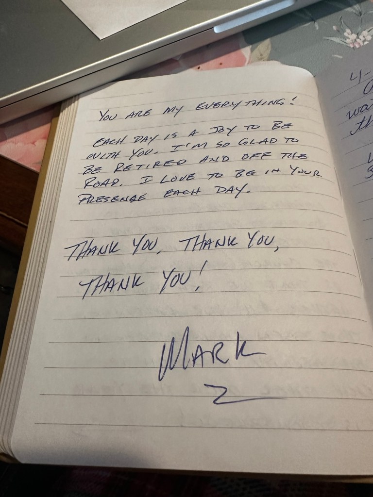 It was not too long after Mark passed that I felt grateful to have been the one to stay behind. I love him and would never want him to have to pass through this grief process. It is truly awful. I am going to share several portions of “love notes” notes that are from Mark. Read them first to know that we loved to be together and that he would not have done well on his own… but more importantly to think of what feelings you might share with your spouse to let them know how much you enjoy being with them…