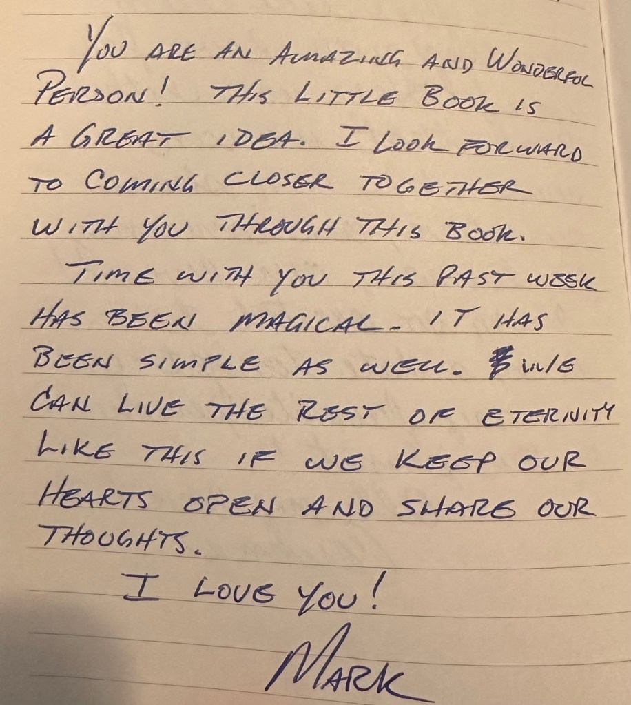 What about our love notes? Mark said all sorts of nice things on paper. So did I. This was our main purpose for keeping this journal – for us it was easier to put the deepest feelings down on paper. I will share three of his entries that I enjoy. (Remember I am only sharing them in the hopes that we can help other couples.) This was Mark’s goal. If it is difficult for you to say loving words aloud, put them in a book or on a post-it note. Here are some of Mark’s words to me: