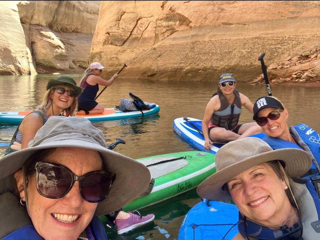 My advantage that day was my group of friends. This stretch of open lake was a couple miles long and the water was rough. We had to hug the shore which was actually a cliff rising above our heads so you didn’t want to get too close. Speed boats and house boats were everywhere and their wake would bounce off this cliff giving us an even more wild ride. Those strong men in the “couple boats” had me discouraged for a bit, but looking around and seeing these five other ladies managing their way helped me on my way. I wasn’t the only newbie and we all called out advice to one another. We shared what was working for us or in what ways we could see someone else needed a little improvement in their form or paddling or whatever. Seeing that they could do this told me that I could do this. Together we can do so much!