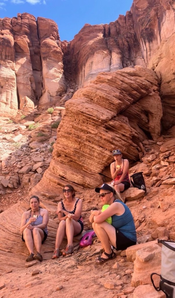Now it was time for a hike and this is more of my comfort zone, though I have never hiked for two miles in “water” shoes. How pleased I was to find that in this group were ladies who, like me, enjoyed stopping to look at the resilient flowers that were blooming in the desert. There was even another woman who, like me, wanted to take time to stop and just put her hands on the rocks. We all did these things and together we began to notice little points of interest in nature that we would have missed had we been with hikers who just wanted to plow through and get it over with. Likewise, I wouldn’t have known that we had these idiosyncrasies in common had we not been out adventuring together.